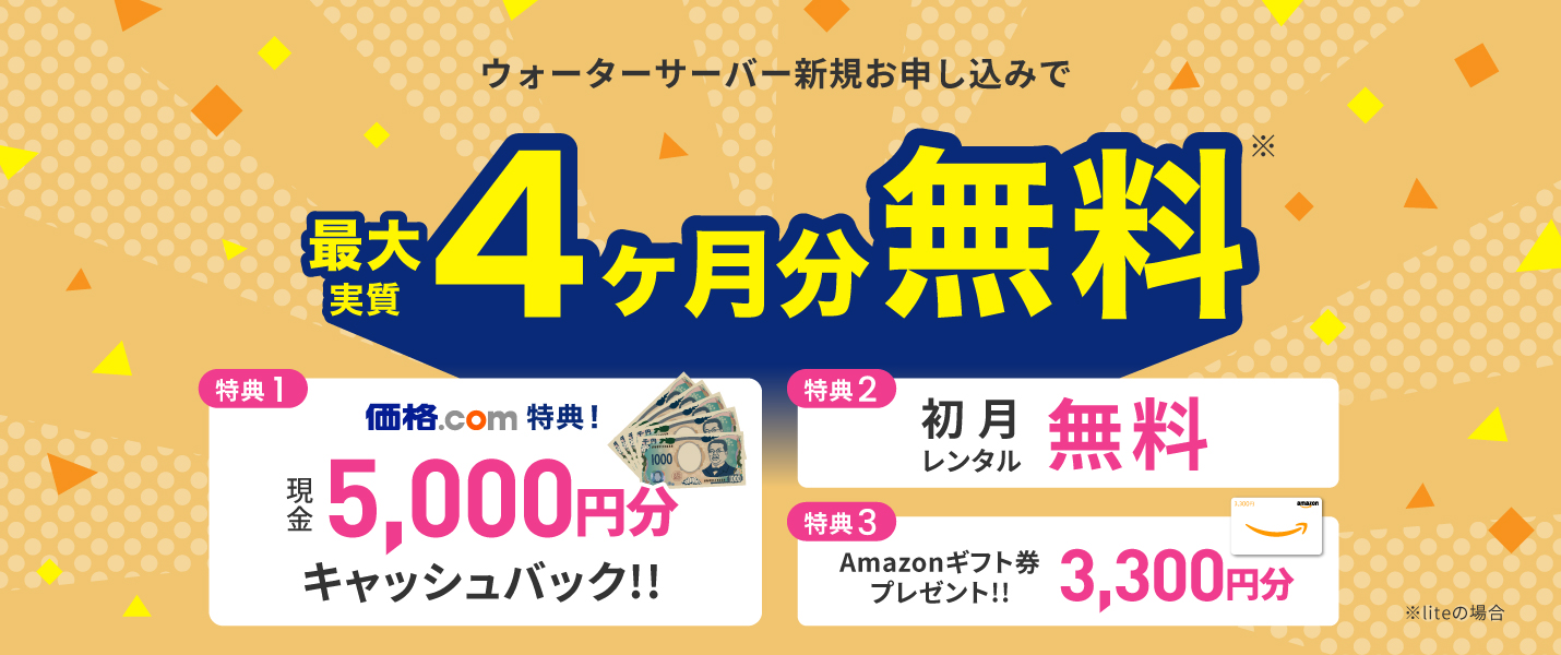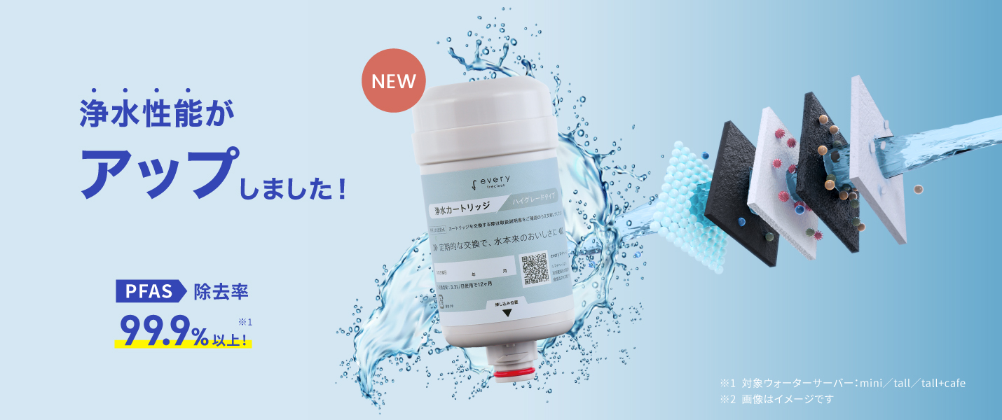 | 特長 | 【価格.com特典あり】新規お申し込みなら、特典で最大実質4か月分無料(最大11,050円相当)。 PFASを99.9%除去する浄水カートリッジは塩素やカルキ臭など最大46種類を除去。 水道水を注ぐだけで手軽においしい水を楽しめます。 お得な最安モデル『lite』や高性能な『tall』の他カフェ機能付き『tall+cafe』やコンパクトな卓上型『mini』など、 豊富なラインアップも魅力。さらに、特別カラーの『mini by BEAMS DESIGN』も話題沸騰中 |