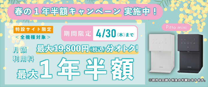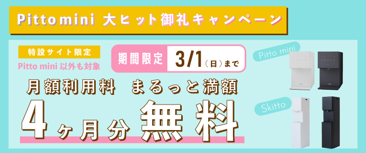 | 特長 | 浄水型ウォーターサーバー「Skitto」「Pitto mini」「Pitto」の3種類がラインナップ。 Pitto miniは月額2,970円で1日7Lまでおいしいお水を浄水可能の卓上タイプ。 節電モード・常温水・定量抽出なども搭載している高機能浄水サーバーが使い放題。 Skittoは月額2,640円でおいしい冷水と温水が使い放題。 マットで高級感のあるデザインに加え、再加熱・節電モードなど多彩な機能を搭載。 |