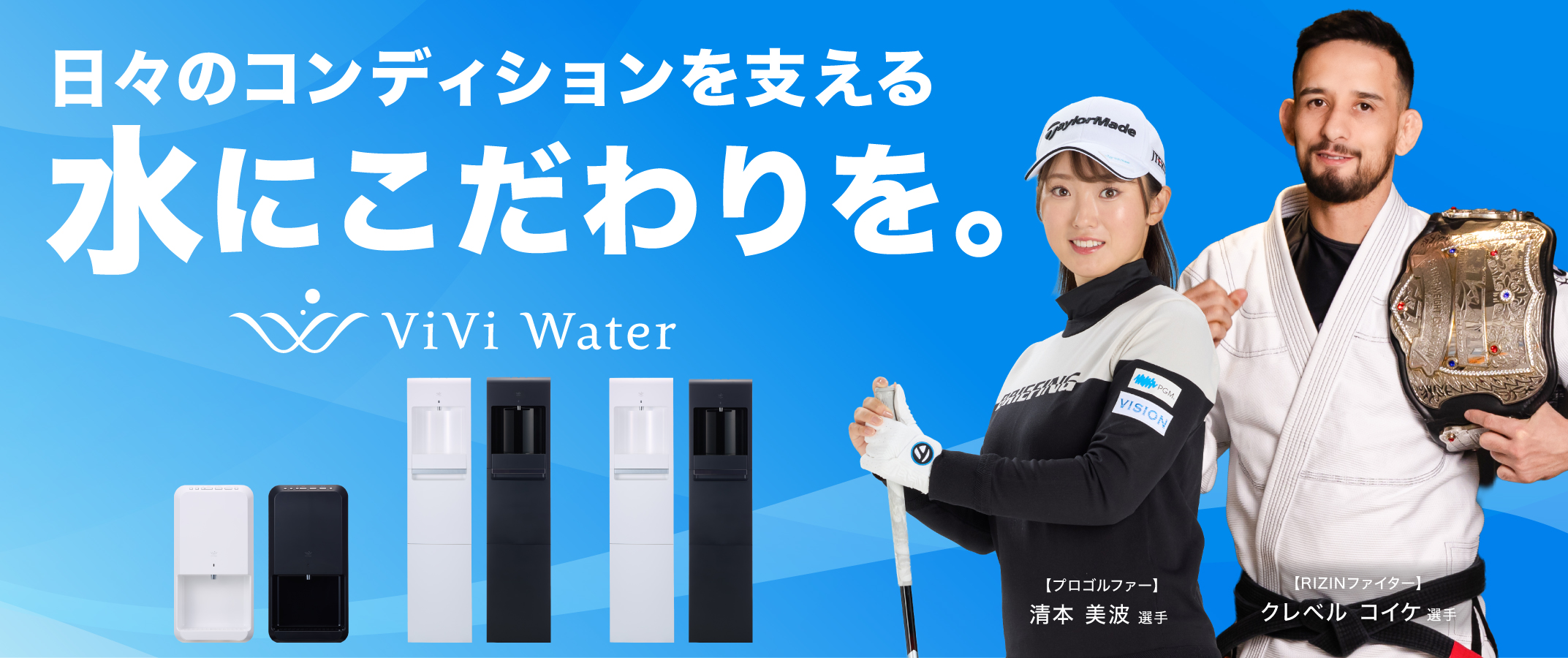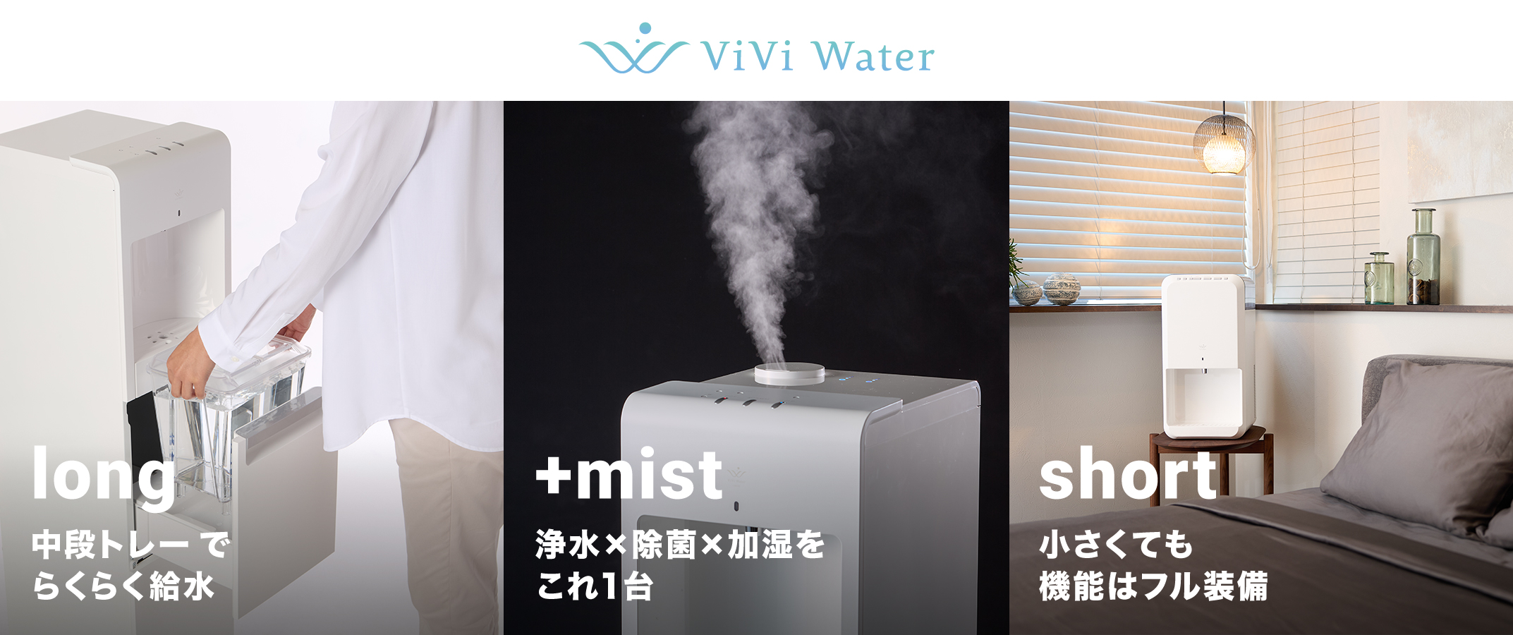 | 特長 | ViVi Waterのウォーターサーバーは2024年新発売!中段タンクで簡単補充!日常の使いやすさにこだわりました。専用カートリッジでPFOSとPFOAを除去、赤ちゃんのミルクにも安心です。全モデル冷水から高温水まで6段階の温度設定可能。タッチボタンで操作も楽々。+mistモデルは噴霧機能で空間を除菌・消臭・加湿。月額3,300円(税込)の定額制で、高機能とスタイリッシュなデザインを兼ね備えたウォーターサーバーです。 |
